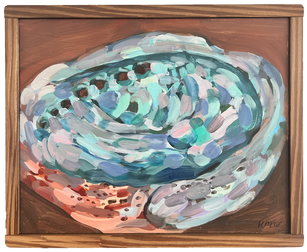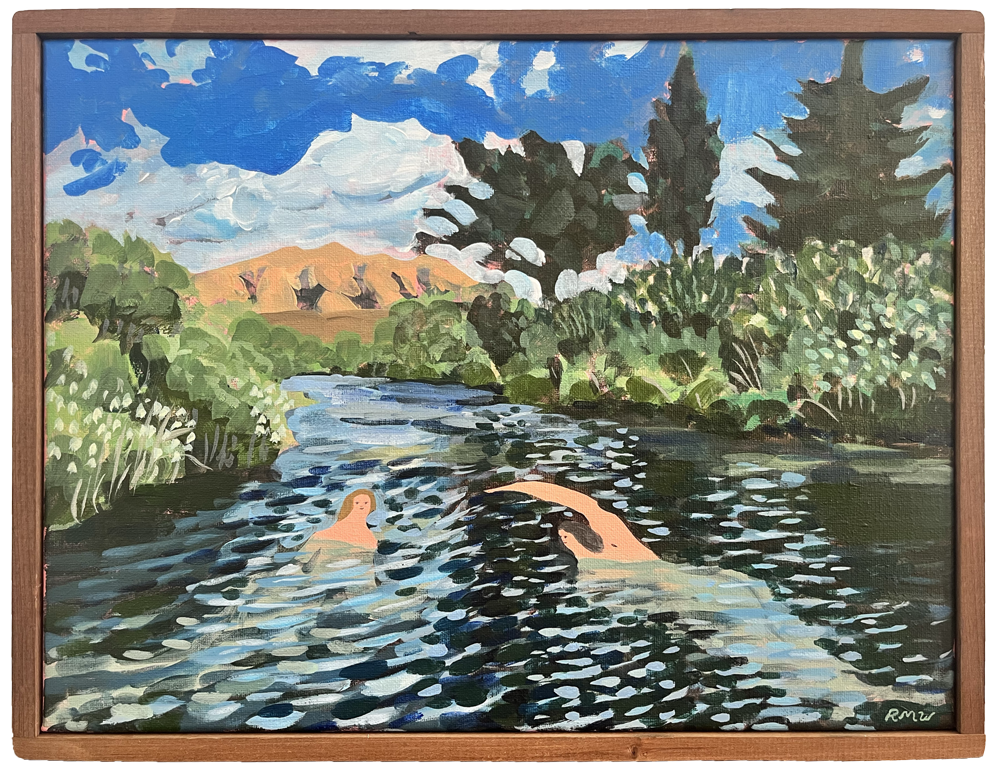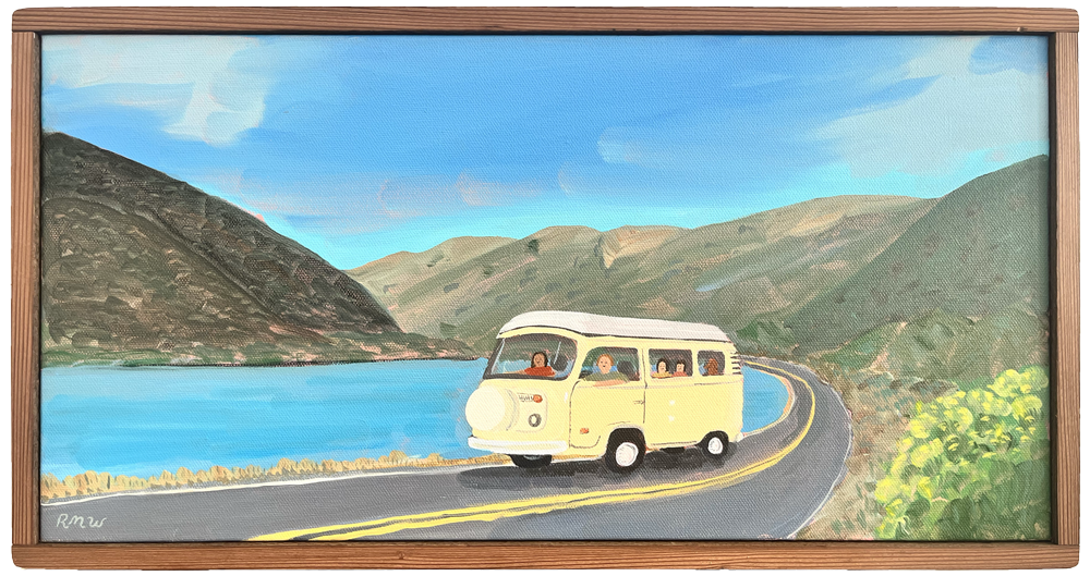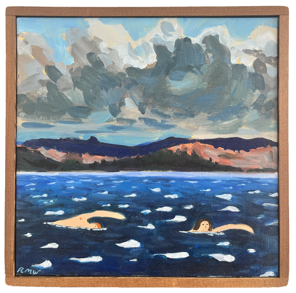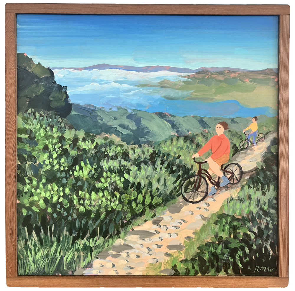 Mount Vision Bike Riders with Tomales Bay Fogscape Acrylic on panel, redwood frame